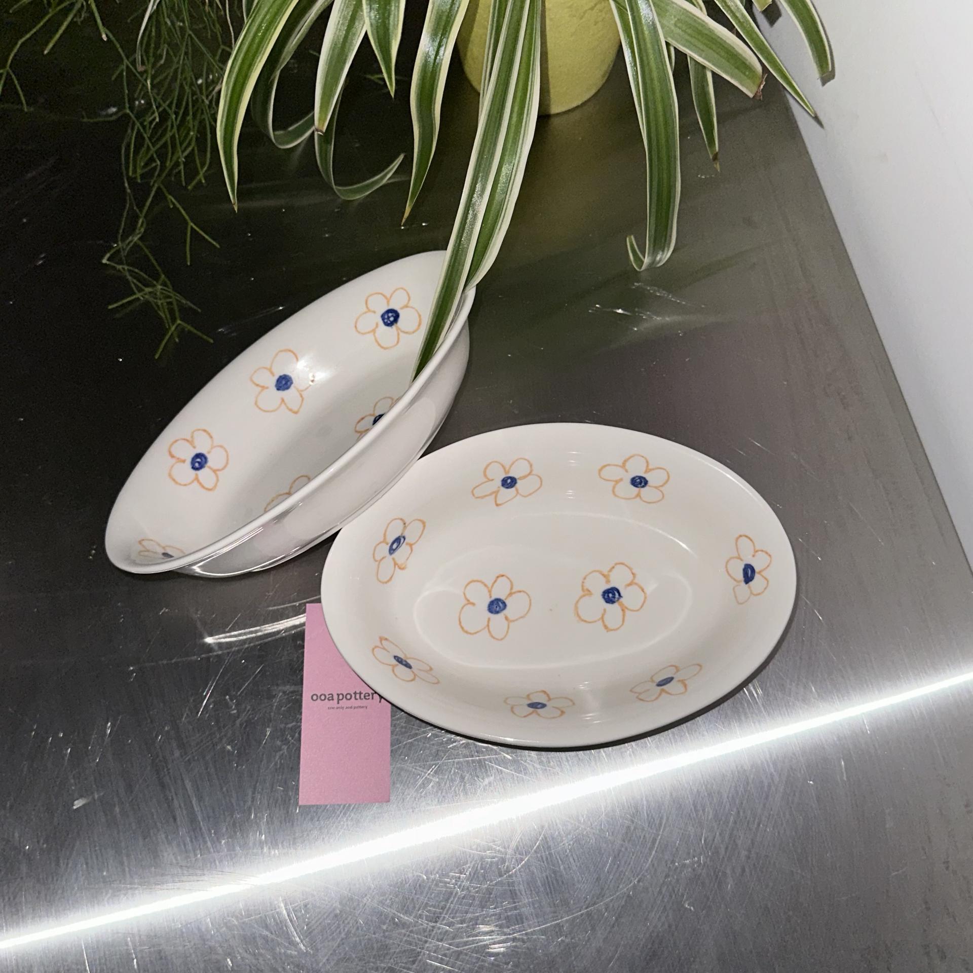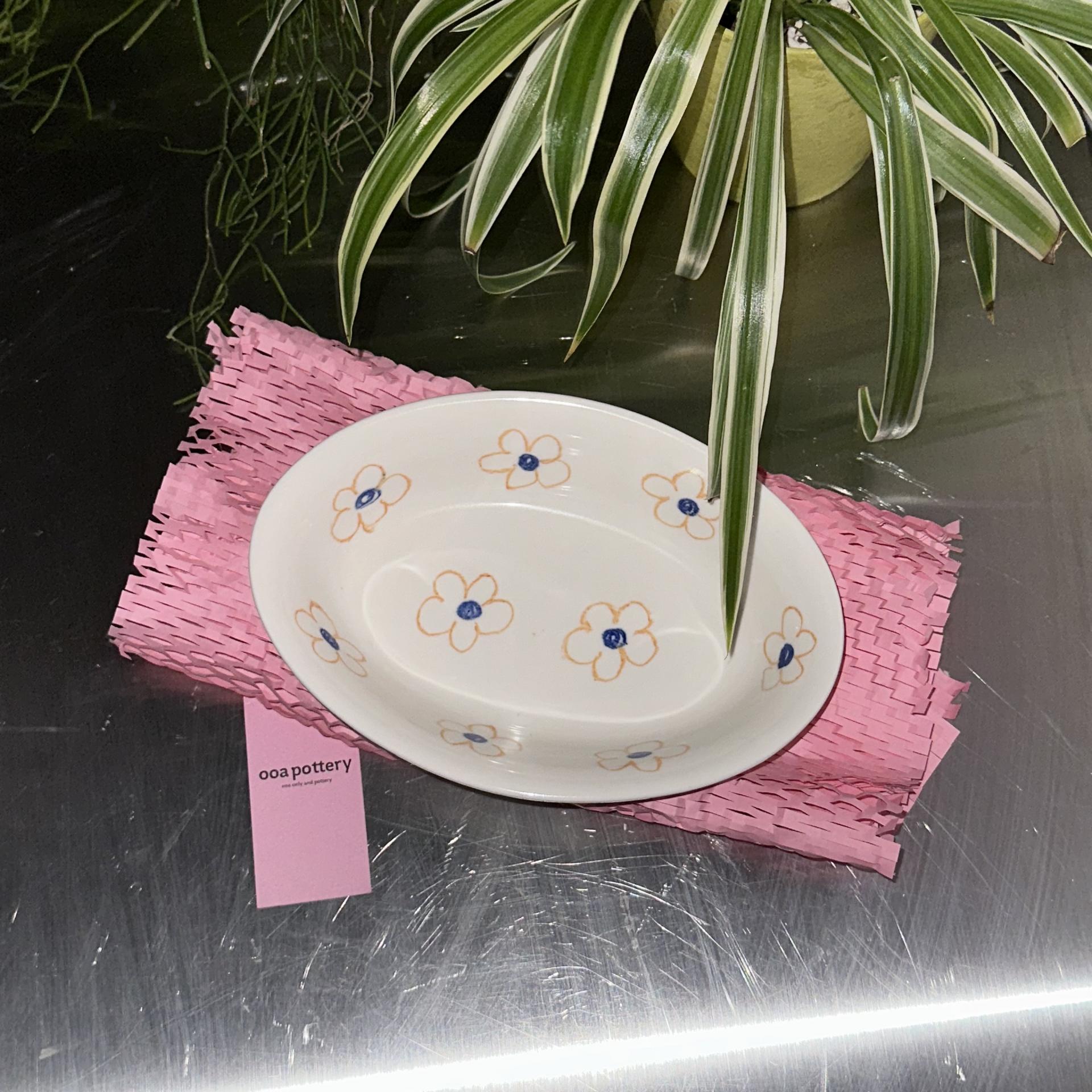 오오아포터리 시그니처 플라워 패턴이 페인팅 되어 있는 orange flower oval bowl 입니다.